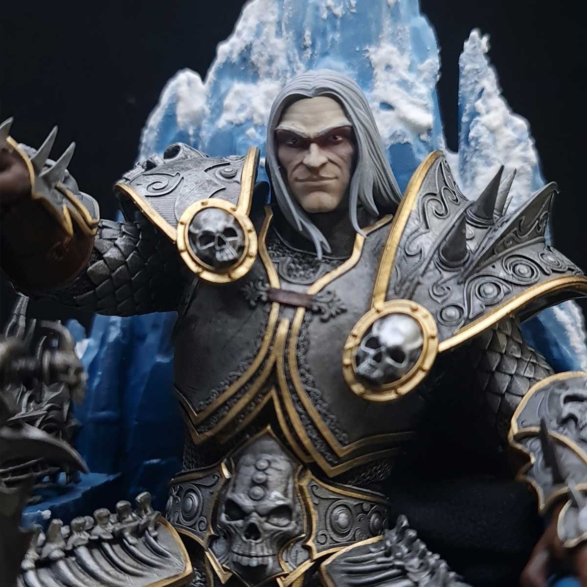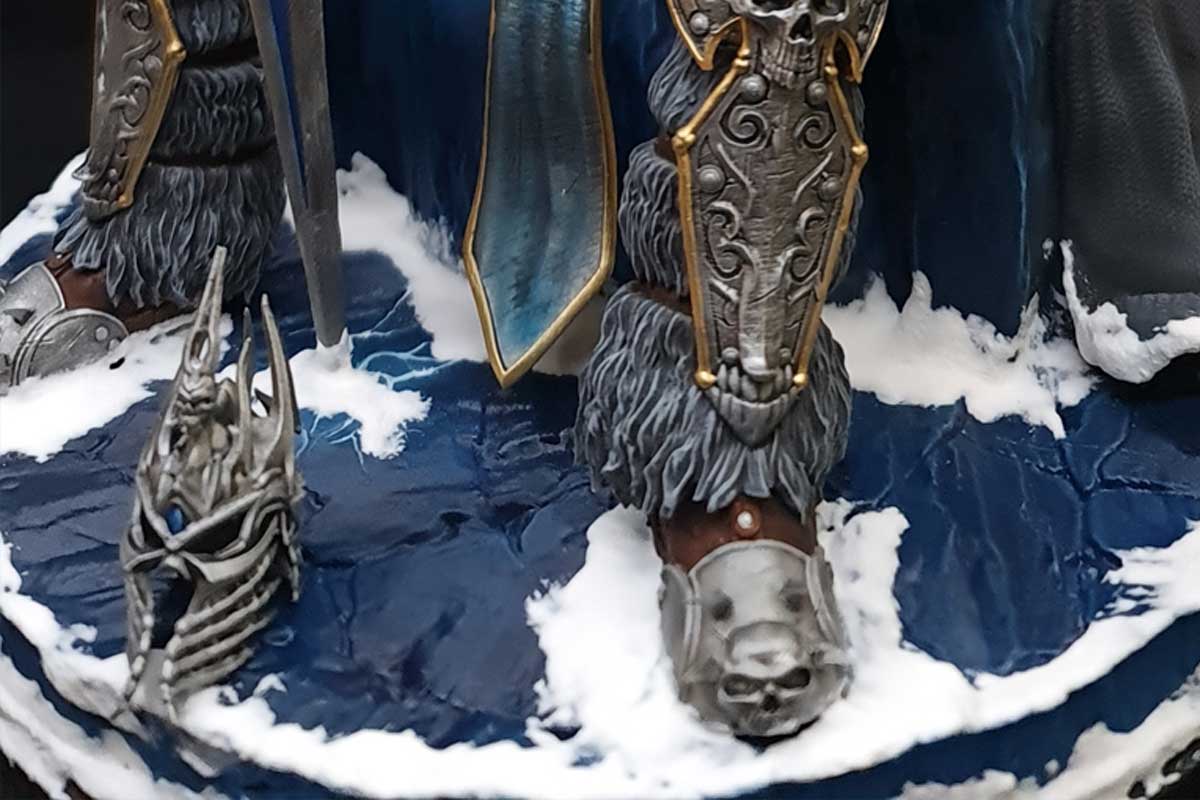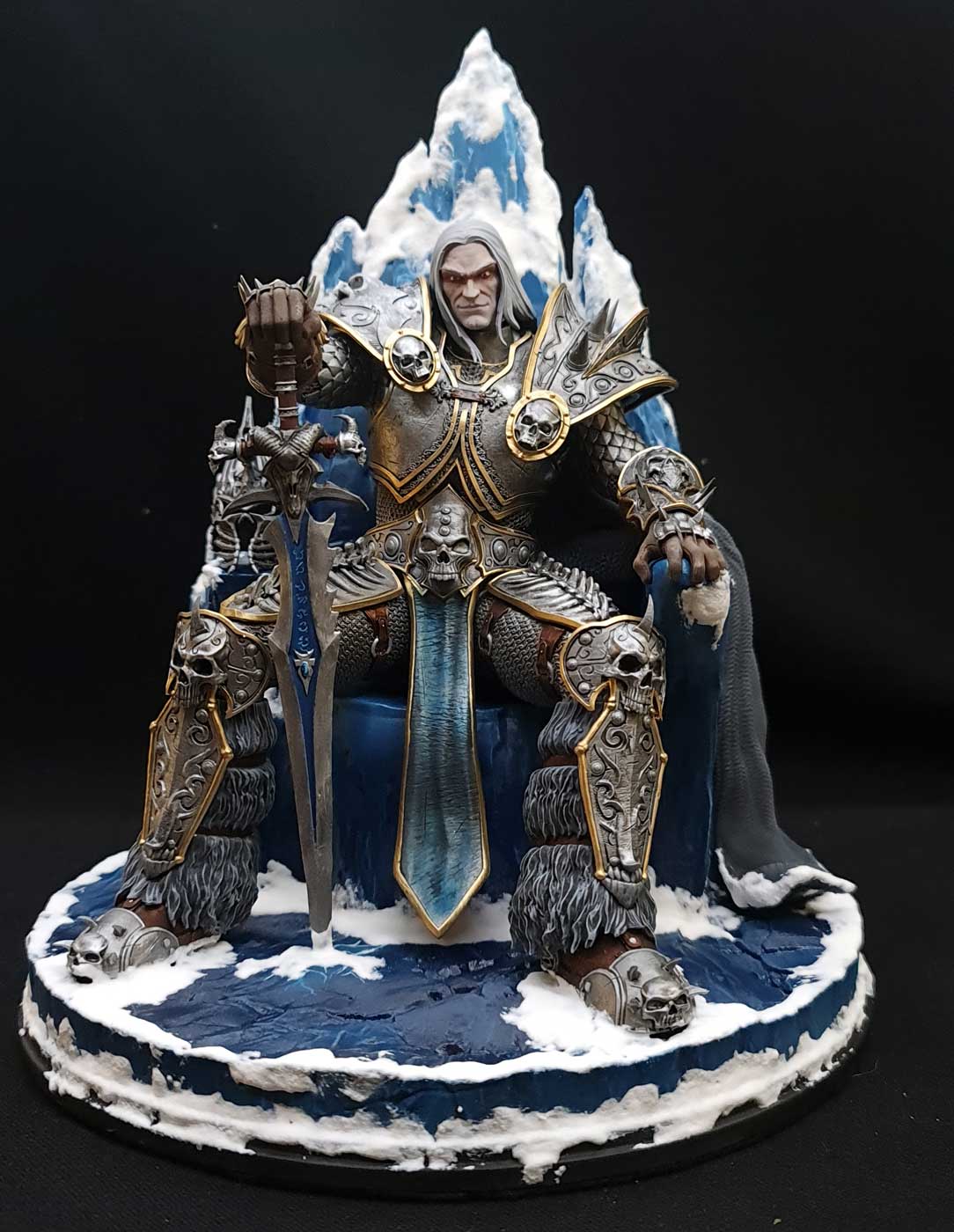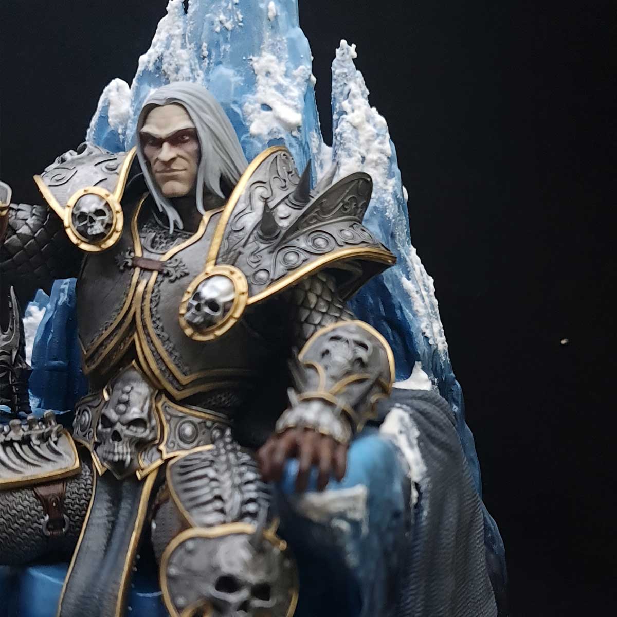 Cada rincón de esta figura ha sido trabajado a mano, y eso se nota. Desde el brillo del trono hasta los tonos cuero de la Frostmourne, todo ha sido cuidado al milímetro. ¿Te gustaría ver cómo se consigue ese efecto hielo tan realista?¿O cómo puedes personalizar la figura según tu estilo?