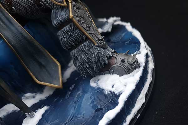 Los detalles de cuero en guantes, botas y la empuñadura de Frostmourne están tratados con varias capas de pintura y degradado para simular el cuero real con matices de marrón, aportando una sensación táctil y visual de altísima calidad.